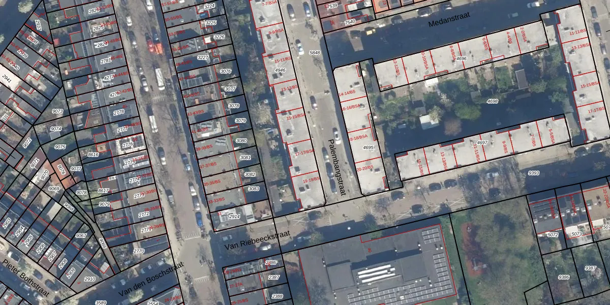 Het perceel waarop Palembangstraat 17-BSA staat heeft een oppervlakte van 1696 m². Dit is een zeer groot perceel. De perceeloppervlakte wordt geregistreerd door het Kadaster. Gedetailleerde informatie over de maten van dit perceel kunt u vinden in het rapport Kadastrale kaart met maatvoering van Palembangstraat 17-BSA.