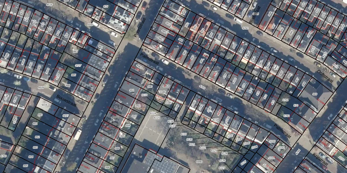 Het perceel waarop Palmstraat 26 staat heeft een oppervlakte van 90 m². Dit is een klein perceel. De perceeloppervlakte wordt geregistreerd door het Kadaster. Gedetailleerde informatie over de maten van dit perceel kunt u vinden in het rapport Kadastrale kaart met maatvoering van Palmstraat 26.
