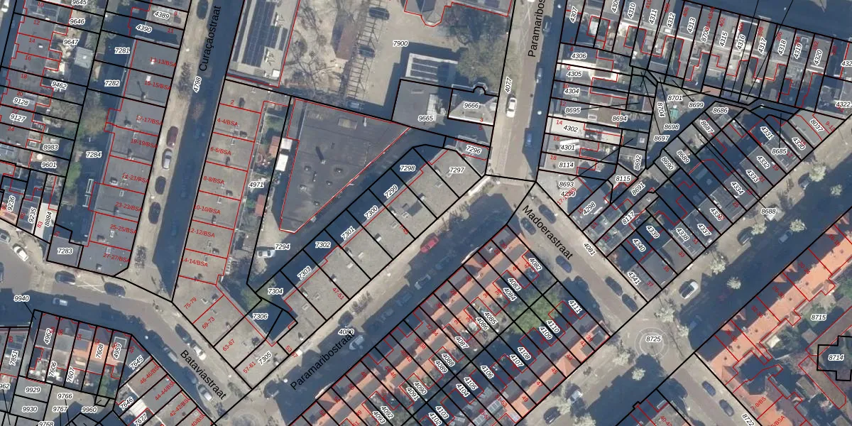 Paramaribostraat 23 is gelegen op kadastraal perceel CTR00C7299. Deze kadastrale aanduiding is uniek en wordt gebruikt door het Kadaster om eigendomsrechten en andere zakelijke rechten vast te leggen. Het perceel maakt onderdeel uit van de kadastrale gemeente Catharijne.