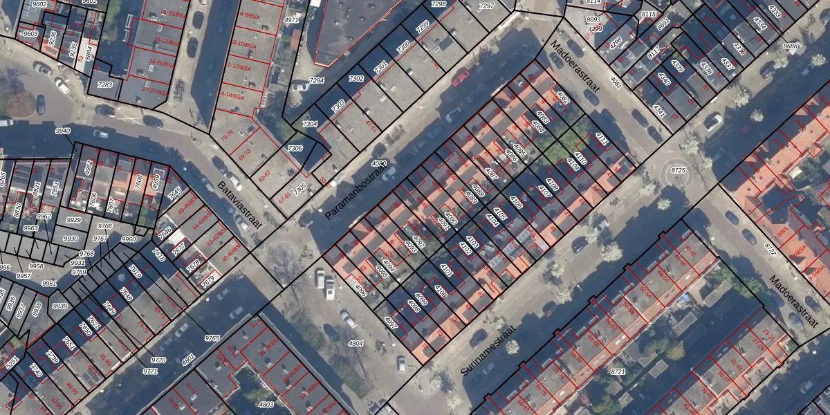 Het perceel waarop Paramaribostraat 46 staat heeft een oppervlakte van 83 m². Dit is een klein perceel. De perceeloppervlakte wordt geregistreerd door het Kadaster. Gedetailleerde informatie over de maten van dit perceel kunt u vinden in het rapport Kadastrale kaart met maatvoering van Paramaribostraat 46.