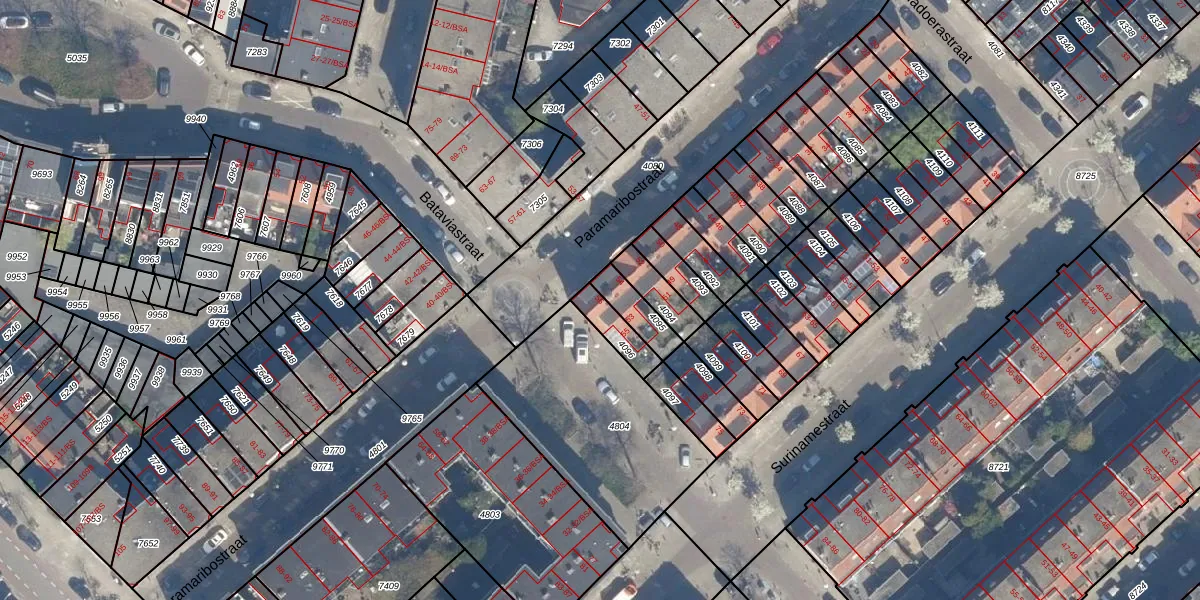 Het perceel waarop Paramaribostraat 56 staat heeft een oppervlakte van 86 m². Dit is een klein perceel. De perceeloppervlakte wordt geregistreerd door het Kadaster. Gedetailleerde informatie over de maten van dit perceel kunt u vinden in het rapport Kadastrale kaart met maatvoering van Paramaribostraat 56.