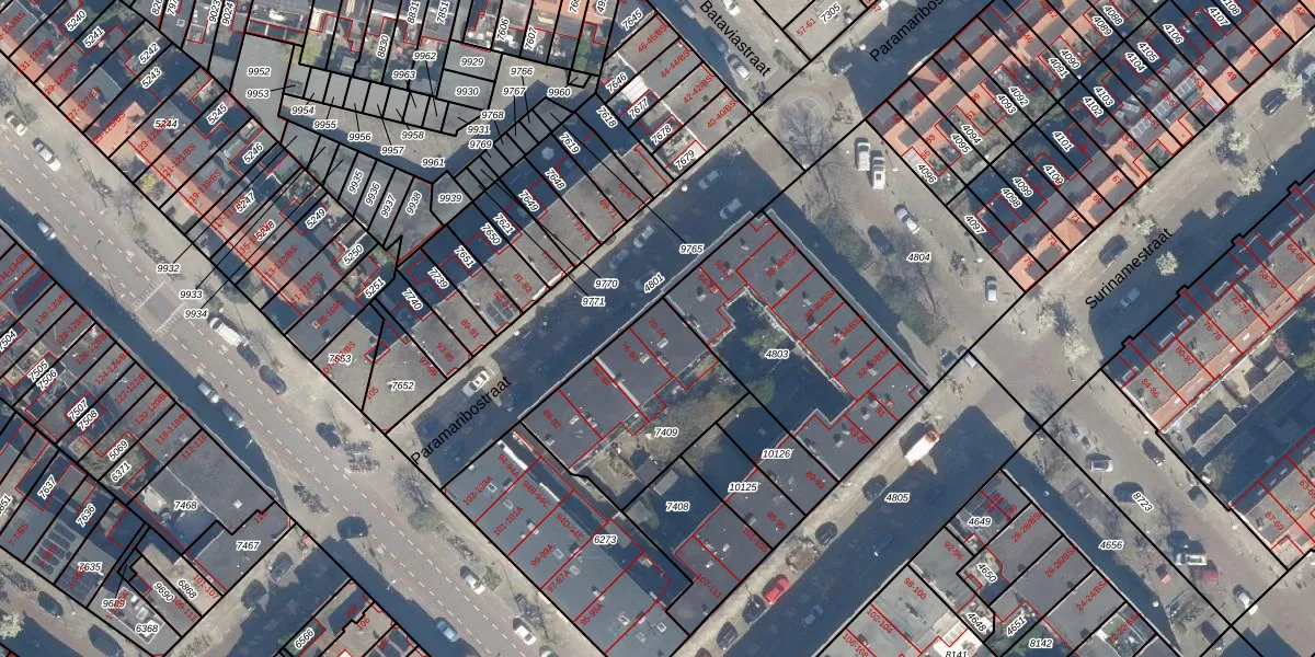 Het perceel waarop Paramaribostraat 74 staat heeft een oppervlakte van 563 m². Dit is een groot perceel. De perceeloppervlakte wordt geregistreerd door het Kadaster. Gedetailleerde informatie over de maten van dit perceel kunt u vinden in het rapport Kadastrale kaart met maatvoering van Paramaribostraat 74.