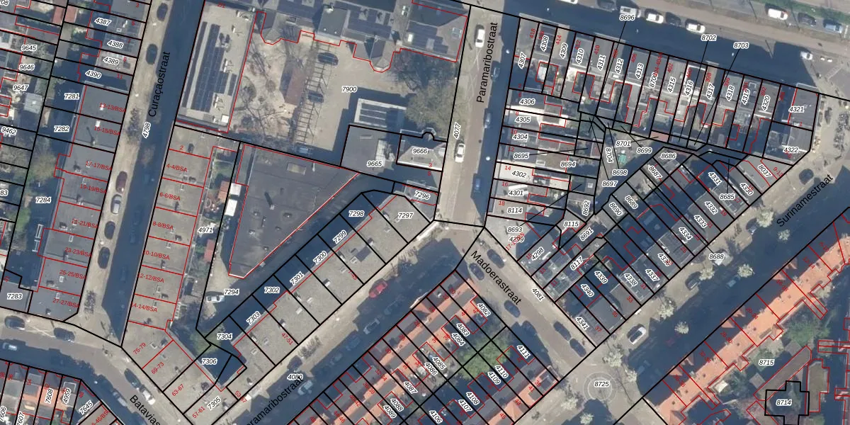 Het perceel waarop Paramaribostraat 9 staat heeft een oppervlakte van 52 m². Dit is een klein perceel. De perceeloppervlakte wordt geregistreerd door het Kadaster. Gedetailleerde informatie over de maten van dit perceel kunt u vinden in het rapport Kadastrale kaart met maatvoering van Paramaribostraat 9.