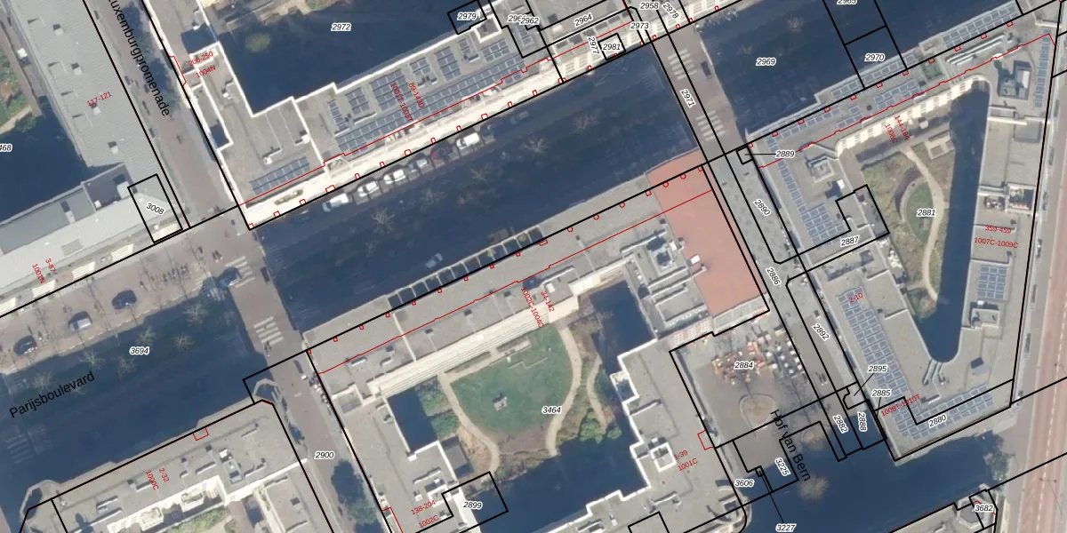 Het perceel waarop Parijsboulevard 14 staat heeft een oppervlakte van 4013 m². Dit is een zeer groot perceel. De perceeloppervlakte wordt geregistreerd door het Kadaster. Gedetailleerde informatie over de maten van dit perceel kunt u vinden in het rapport Kadastrale kaart met maatvoering van Parijsboulevard 14.