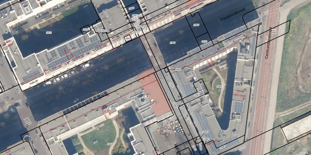 Het perceel waarop Parijsboulevard 44 staat heeft een oppervlakte van 4013 m². Dit is een zeer groot perceel. De perceeloppervlakte wordt geregistreerd door het Kadaster. Gedetailleerde informatie over de maten van dit perceel kunt u vinden in het rapport Kadastrale kaart met maatvoering van Parijsboulevard 44.