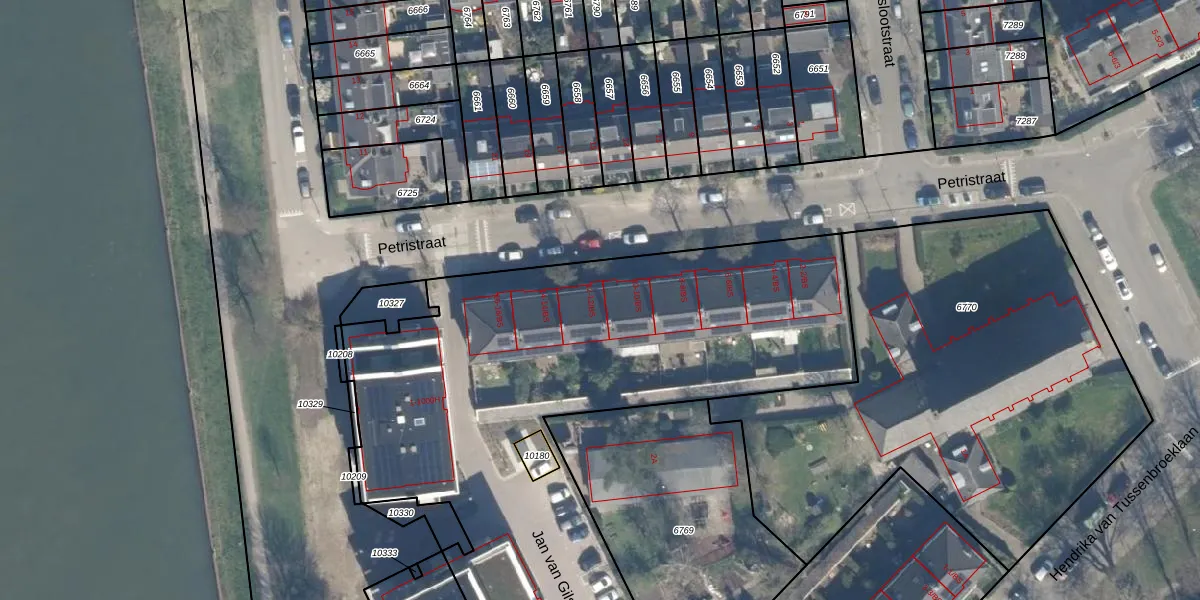 Het perceel waarop Petristraat 12 staat heeft een oppervlakte van 5578 m². Dit is een zeer groot perceel. De perceeloppervlakte wordt geregistreerd door het Kadaster. Gedetailleerde informatie over de maten van dit perceel kunt u vinden in het rapport Kadastrale kaart met maatvoering van Petristraat 12.