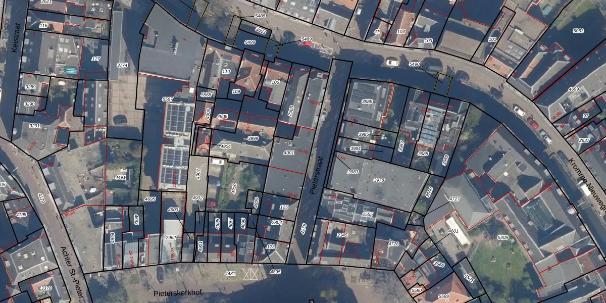 Het perceel waarop Pieterstraat 46 staat heeft een oppervlakte van 406 m². Dit is een groot perceel. De perceeloppervlakte wordt geregistreerd door het Kadaster. Gedetailleerde informatie over de maten van dit perceel kunt u vinden in het rapport Kadastrale kaart met maatvoering van Pieterstraat 46.