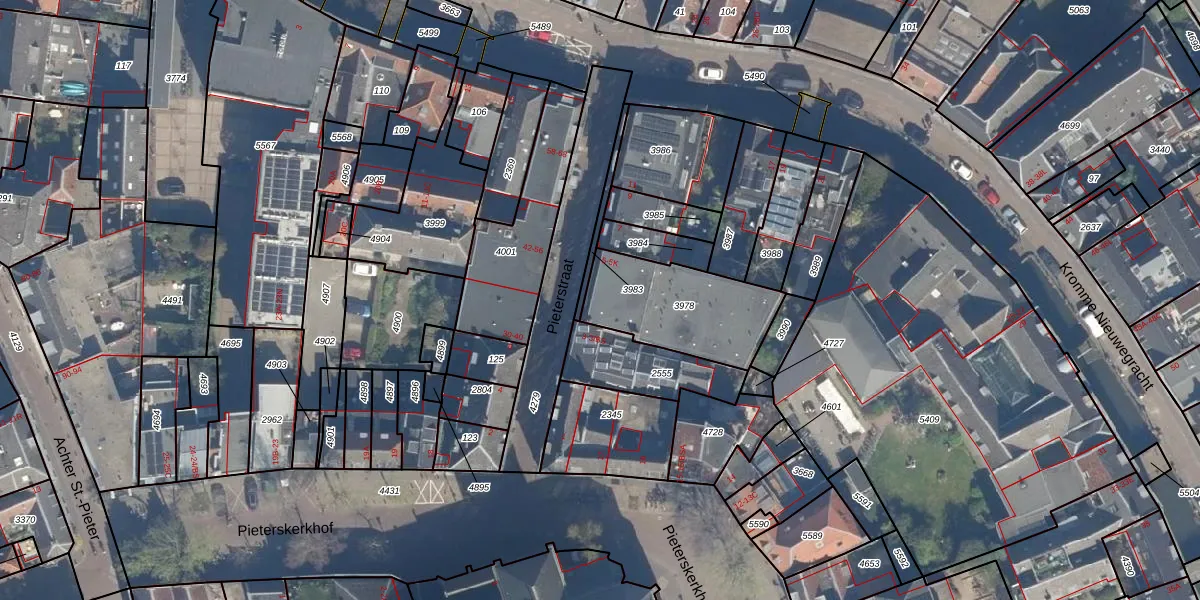 Het perceel waarop Pieterstraat 5-A staat heeft een oppervlakte van 410 m². Dit is een groot perceel. De perceeloppervlakte wordt geregistreerd door het Kadaster. Gedetailleerde informatie over de maten van dit perceel kunt u vinden in het rapport Kadastrale kaart met maatvoering van Pieterstraat 5-A.