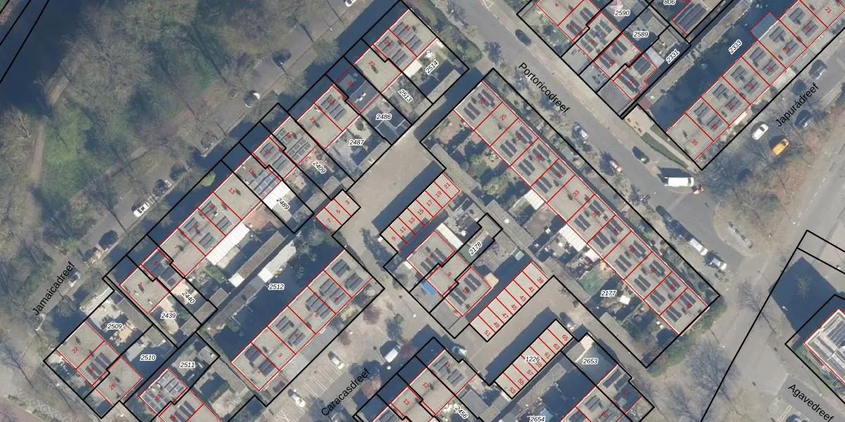 Het perceel waarop Portoricodreef 15 staat heeft een oppervlakte van 2640 m². Dit is een zeer groot perceel. De perceeloppervlakte wordt geregistreerd door het Kadaster. Gedetailleerde informatie over de maten van dit perceel kunt u vinden in het rapport Kadastrale kaart met maatvoering van Portoricodreef 15.