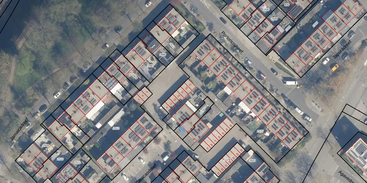 Het perceel waarop Portoricodreef 17 staat heeft een oppervlakte van 2640 m². Dit is een zeer groot perceel. De perceeloppervlakte wordt geregistreerd door het Kadaster. Gedetailleerde informatie over de maten van dit perceel kunt u vinden in het rapport Kadastrale kaart met maatvoering van Portoricodreef 17.