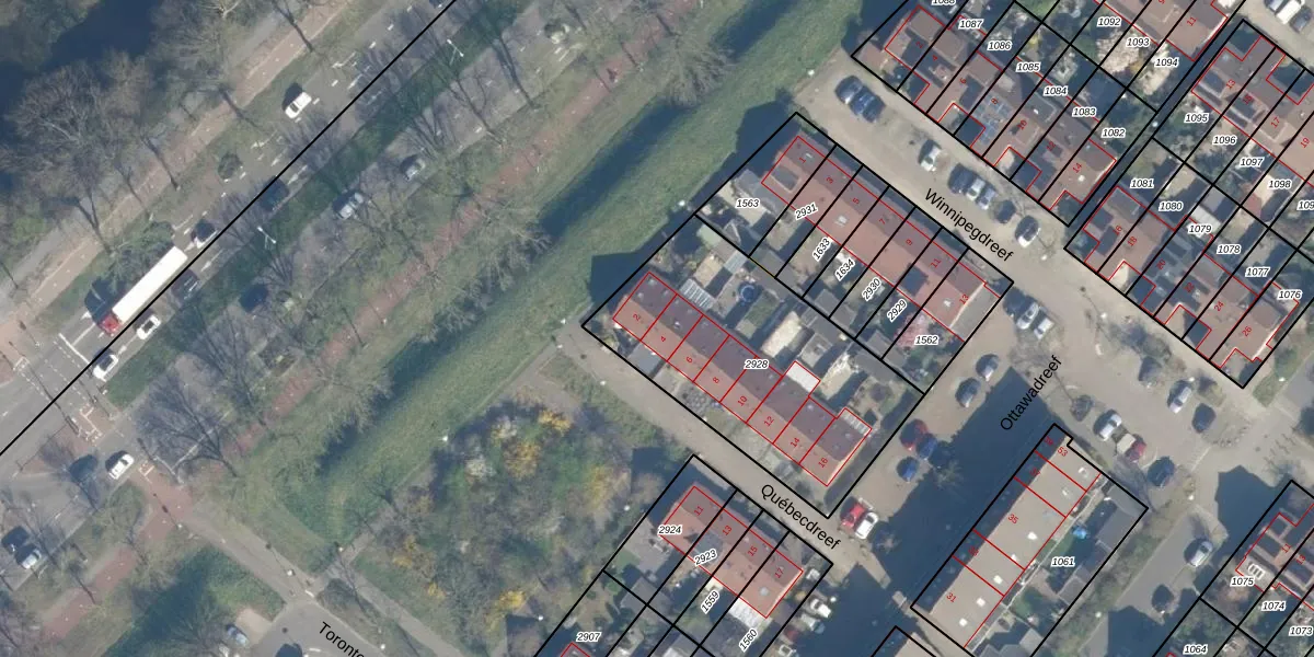 Het perceel waarop Québecdreef 4 staat heeft een oppervlakte van 1106 m². Dit is een zeer groot perceel. De perceeloppervlakte wordt geregistreerd door het Kadaster. Gedetailleerde informatie over de maten van dit perceel kunt u vinden in het rapport Kadastrale kaart met maatvoering van Québecdreef 4.