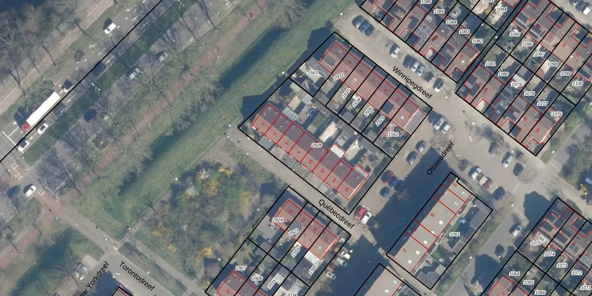 Het perceel waarop Québecdreef 8 staat heeft een oppervlakte van 1106 m². Dit is een zeer groot perceel. De perceeloppervlakte wordt geregistreerd door het Kadaster. Gedetailleerde informatie over de maten van dit perceel kunt u vinden in het rapport Kadastrale kaart met maatvoering van Québecdreef 8.