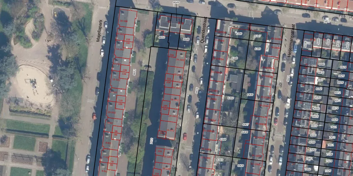 Het perceel waarop Queridostraat 20-2 staat heeft een oppervlakte van 2464 m². Dit is een zeer groot perceel. De perceeloppervlakte wordt geregistreerd door het Kadaster. Gedetailleerde informatie over de maten van dit perceel kunt u vinden in het rapport Kadastrale kaart met maatvoering van Queridostraat 20-2.