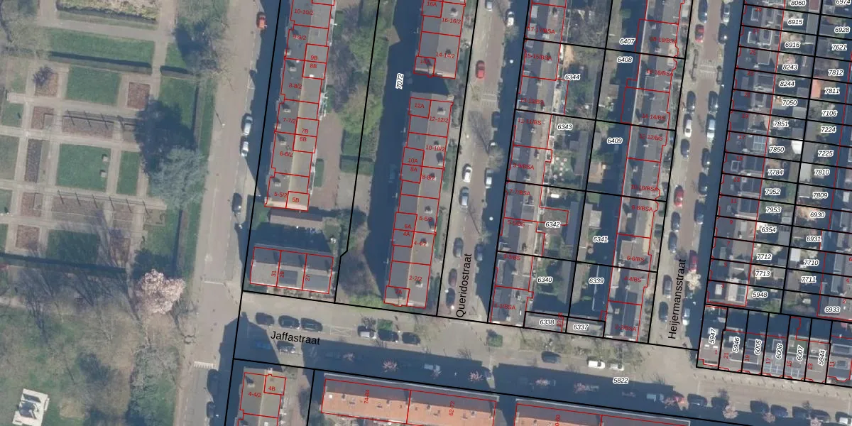 Het perceel waarop Queridostraat 6-1 staat heeft een oppervlakte van 2464 m². Dit is een zeer groot perceel. De perceeloppervlakte wordt geregistreerd door het Kadaster. Gedetailleerde informatie over de maten van dit perceel kunt u vinden in het rapport Kadastrale kaart met maatvoering van Queridostraat 6-1.