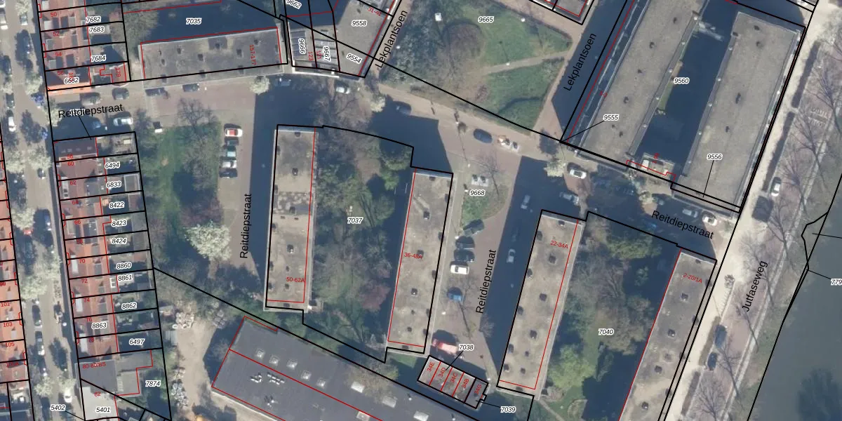 Reitdiepstraat 38 is gelegen op kadastraal perceel CTR00D7037. Deze kadastrale aanduiding is uniek en wordt gebruikt door het Kadaster om eigendomsrechten en andere zakelijke rechten vast te leggen. Het perceel maakt onderdeel uit van de kadastrale gemeente Catharijne.