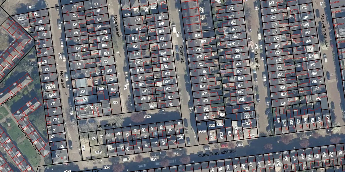 Het perceel waarop Renstraat 21 staat heeft een oppervlakte van 54 m². Dit is een klein perceel. De perceeloppervlakte wordt geregistreerd door het Kadaster. Gedetailleerde informatie over de maten van dit perceel kunt u vinden in het rapport Kadastrale kaart met maatvoering van Renstraat 21.