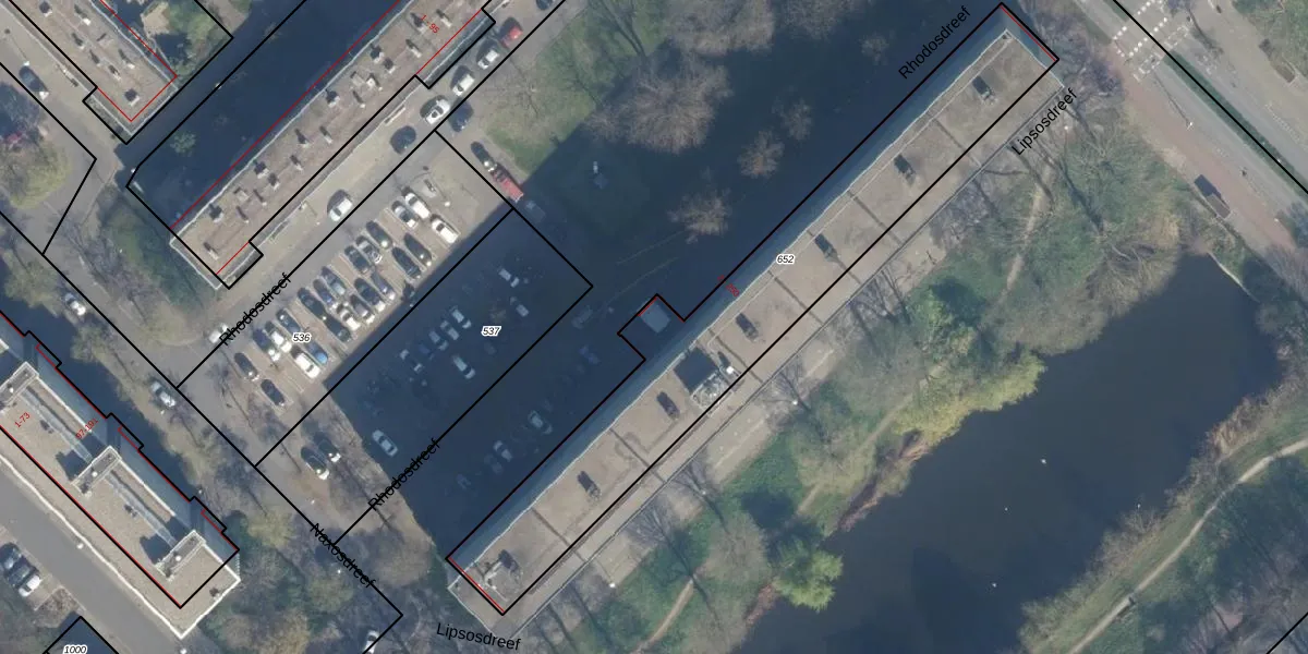 Het perceel waarop Rhodosdreef 152 staat heeft een oppervlakte van 1527 m². Dit is een zeer groot perceel. De perceeloppervlakte wordt geregistreerd door het Kadaster. Gedetailleerde informatie over de maten van dit perceel kunt u vinden in het rapport Kadastrale kaart met maatvoering van Rhodosdreef 152.