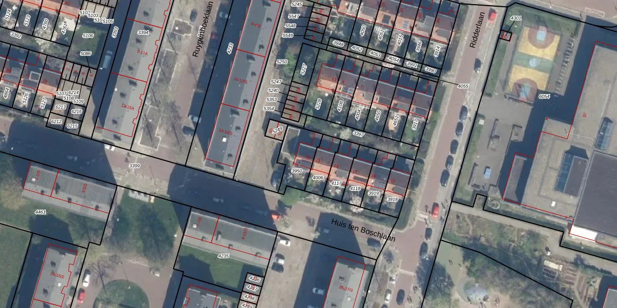 Ridderlaan 23 is gelegen op kadastraal perceel UTT00P3950. Deze kadastrale aanduiding is uniek en wordt gebruikt door het Kadaster om eigendomsrechten en andere zakelijke rechten vast te leggen. Het perceel maakt onderdeel uit van de kadastrale gemeente Utrecht.