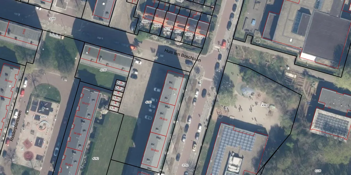 Ridderlaan 25 is gelegen op kadastraal perceel UTT00P4243. Deze kadastrale aanduiding is uniek en wordt gebruikt door het Kadaster om eigendomsrechten en andere zakelijke rechten vast te leggen. Het perceel maakt onderdeel uit van de kadastrale gemeente Utrecht.