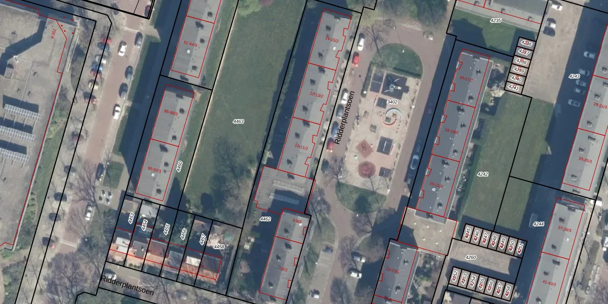 Ridderplantsoen 10 is gelegen op kadastraal perceel UTT00P4462. Deze kadastrale aanduiding is uniek en wordt gebruikt door het Kadaster om eigendomsrechten en andere zakelijke rechten vast te leggen. Het perceel maakt onderdeel uit van de kadastrale gemeente Utrecht.
