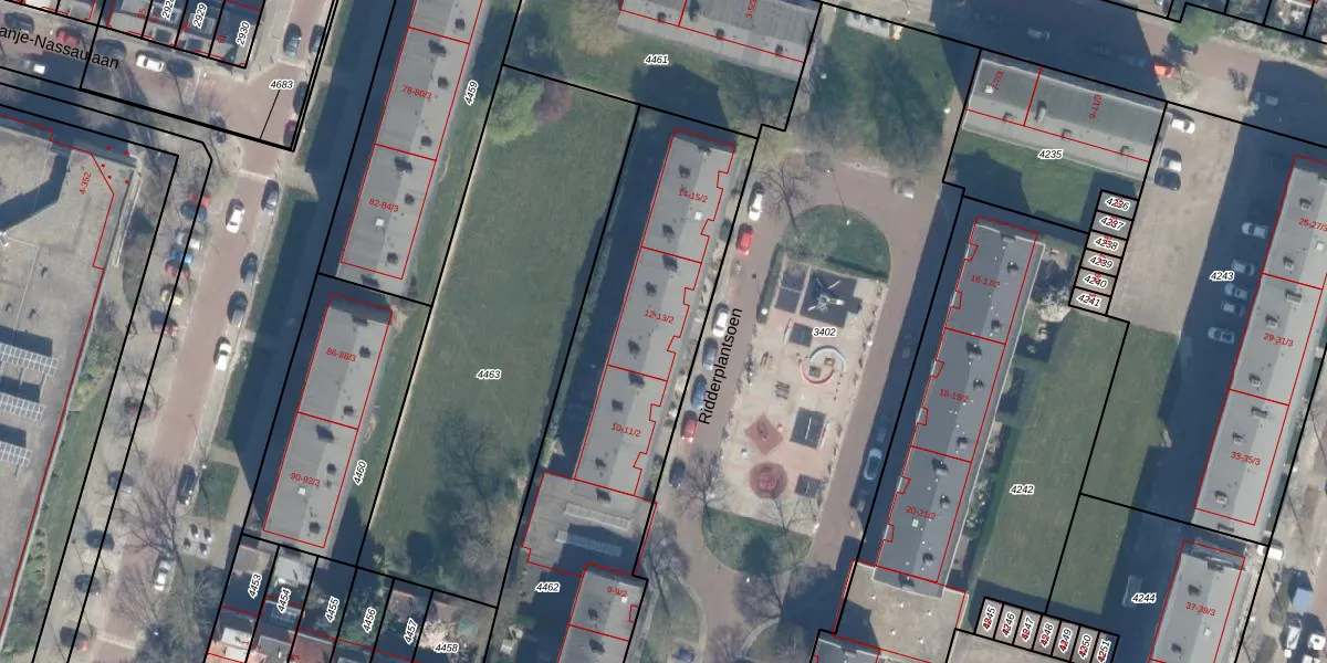 Het perceel waarop Ridderplantsoen 12-1 staat heeft een oppervlakte van 1953 m². Dit is een zeer groot perceel. De perceeloppervlakte wordt geregistreerd door het Kadaster. Gedetailleerde informatie over de maten van dit perceel kunt u vinden in het rapport Kadastrale kaart met maatvoering van Ridderplantsoen 12-1.