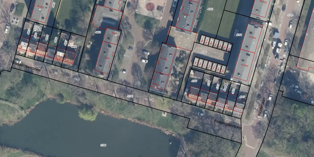 Het perceel waarop Ridderplantsoen 24-2 staat heeft een oppervlakte van 2415 m². Dit is een zeer groot perceel. De perceeloppervlakte wordt geregistreerd door het Kadaster. Gedetailleerde informatie over de maten van dit perceel kunt u vinden in het rapport Kadastrale kaart met maatvoering van Ridderplantsoen 24-2.