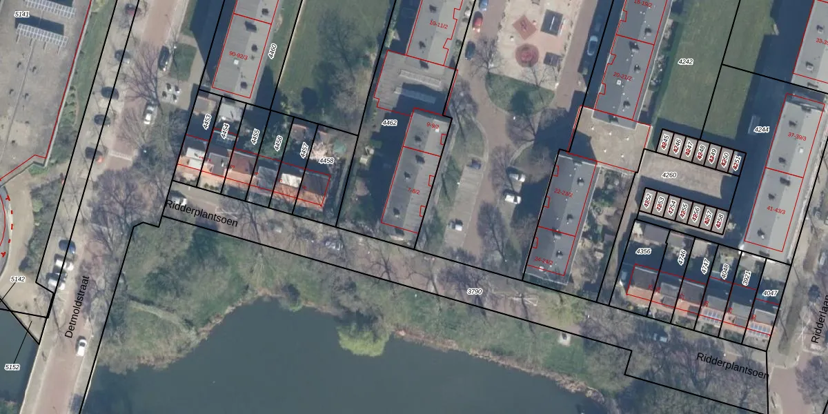 Het perceel waarop Ridderplantsoen 7-2 staat heeft een oppervlakte van 1953 m². Dit is een zeer groot perceel. De perceeloppervlakte wordt geregistreerd door het Kadaster. Gedetailleerde informatie over de maten van dit perceel kunt u vinden in het rapport Kadastrale kaart met maatvoering van Ridderplantsoen 7-2.