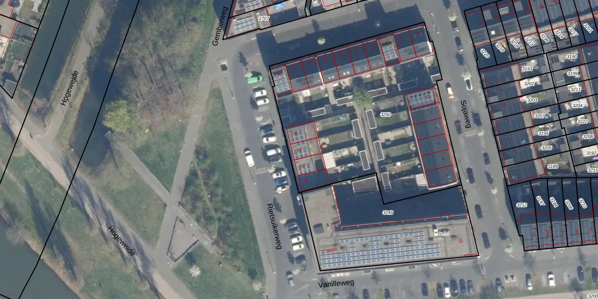 Rietsuikerweg 54 is gelegen op kadastraal perceel CTR00F3250. Deze kadastrale aanduiding is uniek en wordt gebruikt door het Kadaster om eigendomsrechten en andere zakelijke rechten vast te leggen. Het perceel maakt onderdeel uit van de kadastrale gemeente Catharijne.