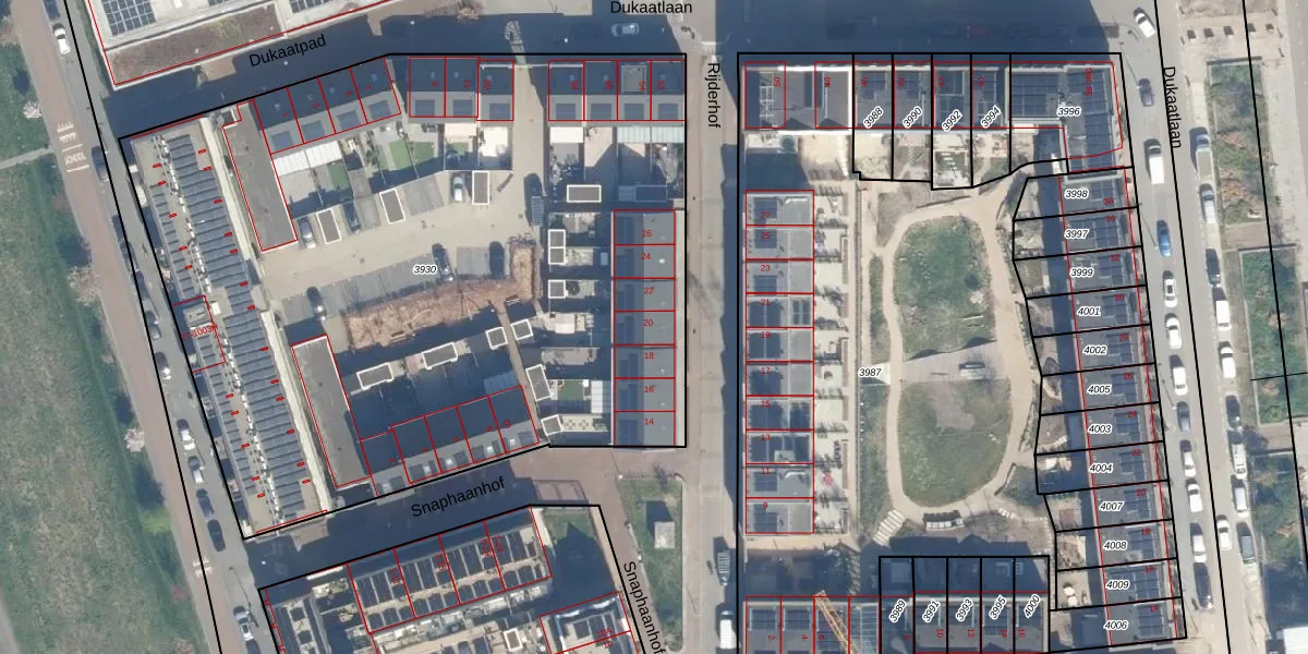 Het perceel waarop Rijderhof 20 staat heeft een oppervlakte van 4945 m². Dit is een zeer groot perceel. De perceeloppervlakte wordt geregistreerd door het Kadaster. Gedetailleerde informatie over de maten van dit perceel kunt u vinden in het rapport Kadastrale kaart met maatvoering van Rijderhof 20.