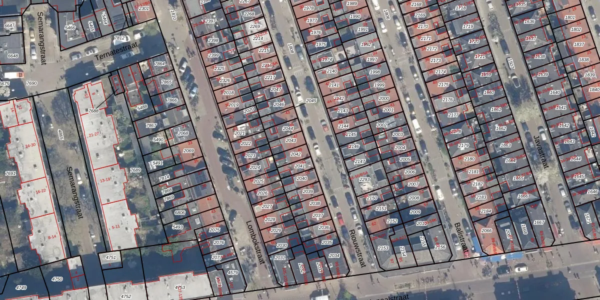 Het perceel waarop Riouwstraat 49 staat heeft een oppervlakte van 53 m². Dit is een klein perceel. De perceeloppervlakte wordt geregistreerd door het Kadaster. Gedetailleerde informatie over de maten van dit perceel kunt u vinden in het rapport Kadastrale kaart met maatvoering van Riouwstraat 49.