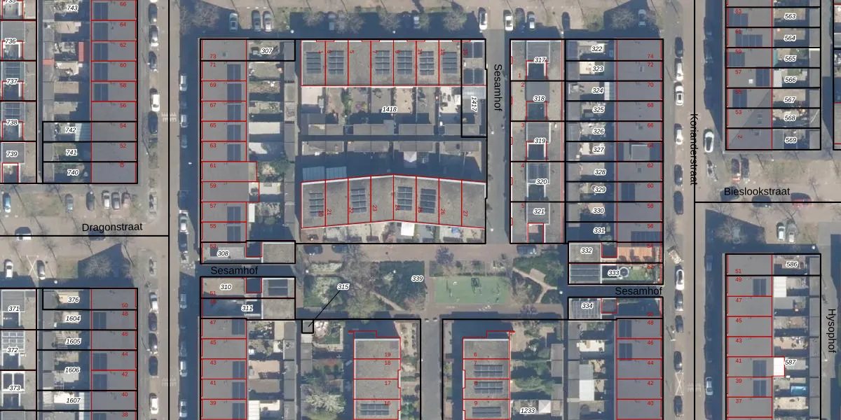 Het perceel waarop Sesamhof 25 staat heeft een oppervlakte van 3045 m². Dit is een zeer groot perceel. De perceeloppervlakte wordt geregistreerd door het Kadaster. Gedetailleerde informatie over de maten van dit perceel kunt u vinden in het rapport Kadastrale kaart met maatvoering van Sesamhof 25.