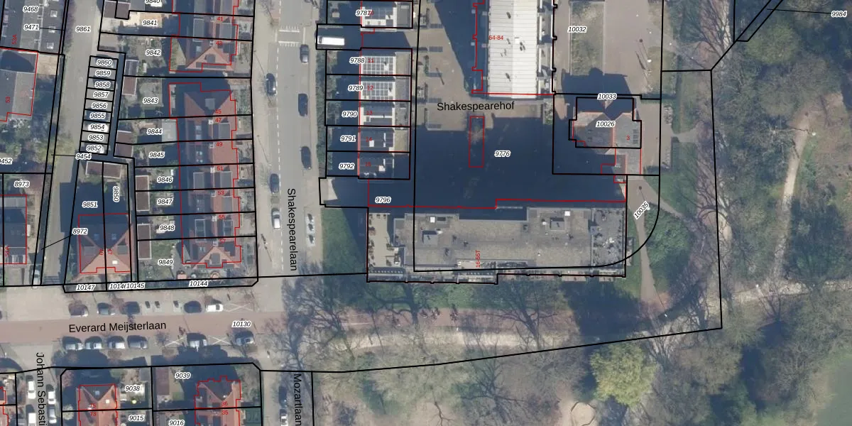 Het perceel waarop Shakespearehof 26 staat heeft een oppervlakte van 2958 m². Dit is een zeer groot perceel. De perceeloppervlakte wordt geregistreerd door het Kadaster. Gedetailleerde informatie over de maten van dit perceel kunt u vinden in het rapport Kadastrale kaart met maatvoering van Shakespearehof 26.