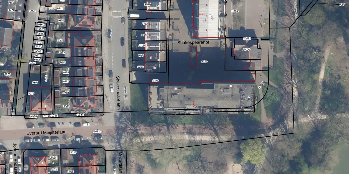 Het perceel waarop Shakespearehof 36 staat heeft een oppervlakte van 2958 m². Dit is een zeer groot perceel. De perceeloppervlakte wordt geregistreerd door het Kadaster. Gedetailleerde informatie over de maten van dit perceel kunt u vinden in het rapport Kadastrale kaart met maatvoering van Shakespearehof 36.