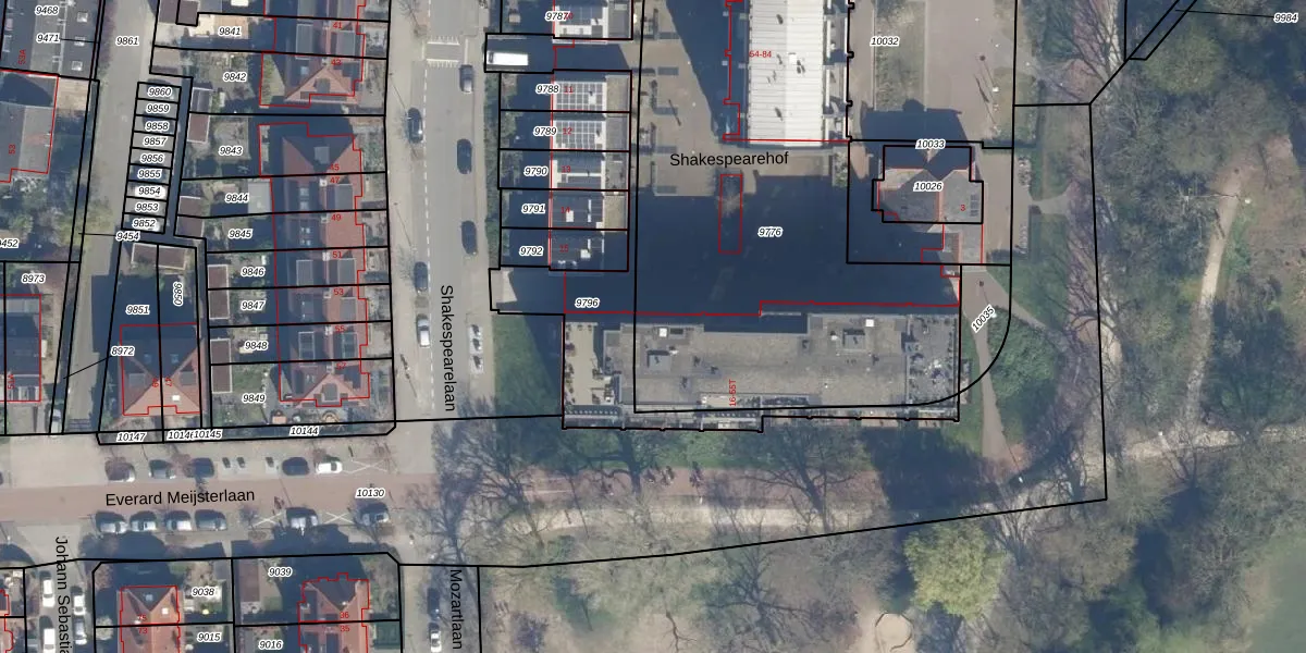 Het perceel waarop Shakespearehof 38 staat heeft een oppervlakte van 2958 m². Dit is een zeer groot perceel. De perceeloppervlakte wordt geregistreerd door het Kadaster. Gedetailleerde informatie over de maten van dit perceel kunt u vinden in het rapport Kadastrale kaart met maatvoering van Shakespearehof 38.
