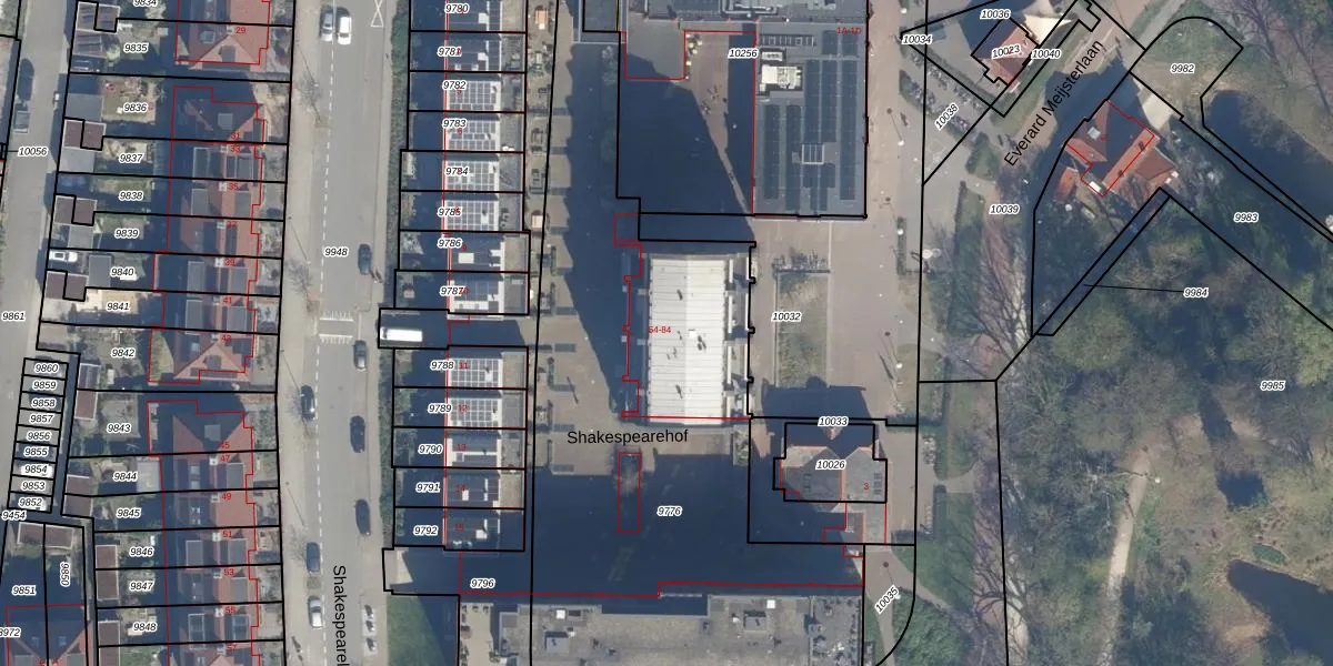Het perceel waarop Shakespearehof 56-T staat heeft een oppervlakte van 2958 m². Dit is een zeer groot perceel. De perceeloppervlakte wordt geregistreerd door het Kadaster. Gedetailleerde informatie over de maten van dit perceel kunt u vinden in het rapport Kadastrale kaart met maatvoering van Shakespearehof 56-T.