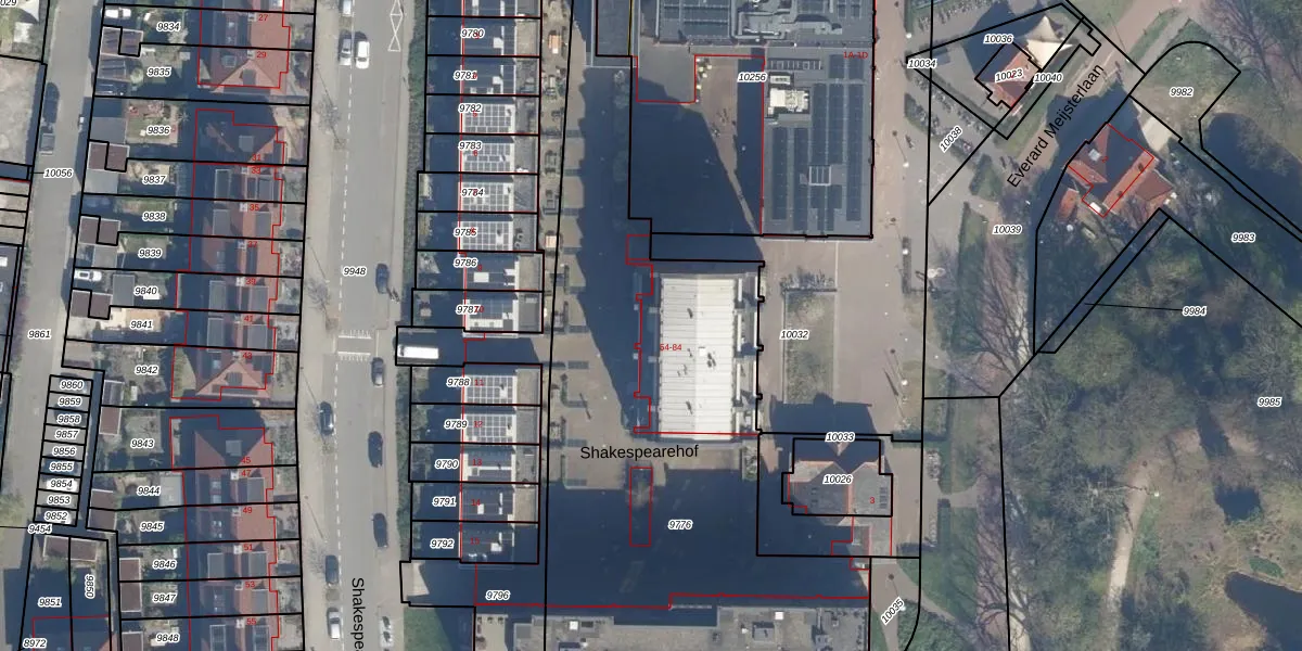Het perceel waarop Shakespearehof 65 staat heeft een oppervlakte van 2958 m². Dit is een zeer groot perceel. De perceeloppervlakte wordt geregistreerd door het Kadaster. Gedetailleerde informatie over de maten van dit perceel kunt u vinden in het rapport Kadastrale kaart met maatvoering van Shakespearehof 65.