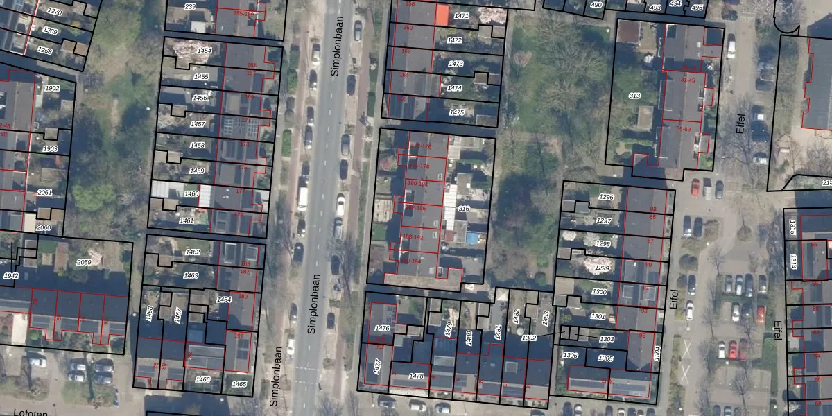 Het perceel waarop Simplonbaan 182 staat heeft een oppervlakte van 1040 m². Dit is een zeer groot perceel. De perceeloppervlakte wordt geregistreerd door het Kadaster. Gedetailleerde informatie over de maten van dit perceel kunt u vinden in het rapport Kadastrale kaart met maatvoering van Simplonbaan 182.