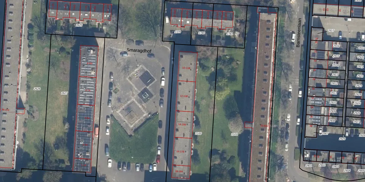 Het perceel waarop Smaragdhof 12-1 staat heeft een oppervlakte van 1878 m². Dit is een zeer groot perceel. De perceeloppervlakte wordt geregistreerd door het Kadaster. Gedetailleerde informatie over de maten van dit perceel kunt u vinden in het rapport Kadastrale kaart met maatvoering van Smaragdhof 12-1.