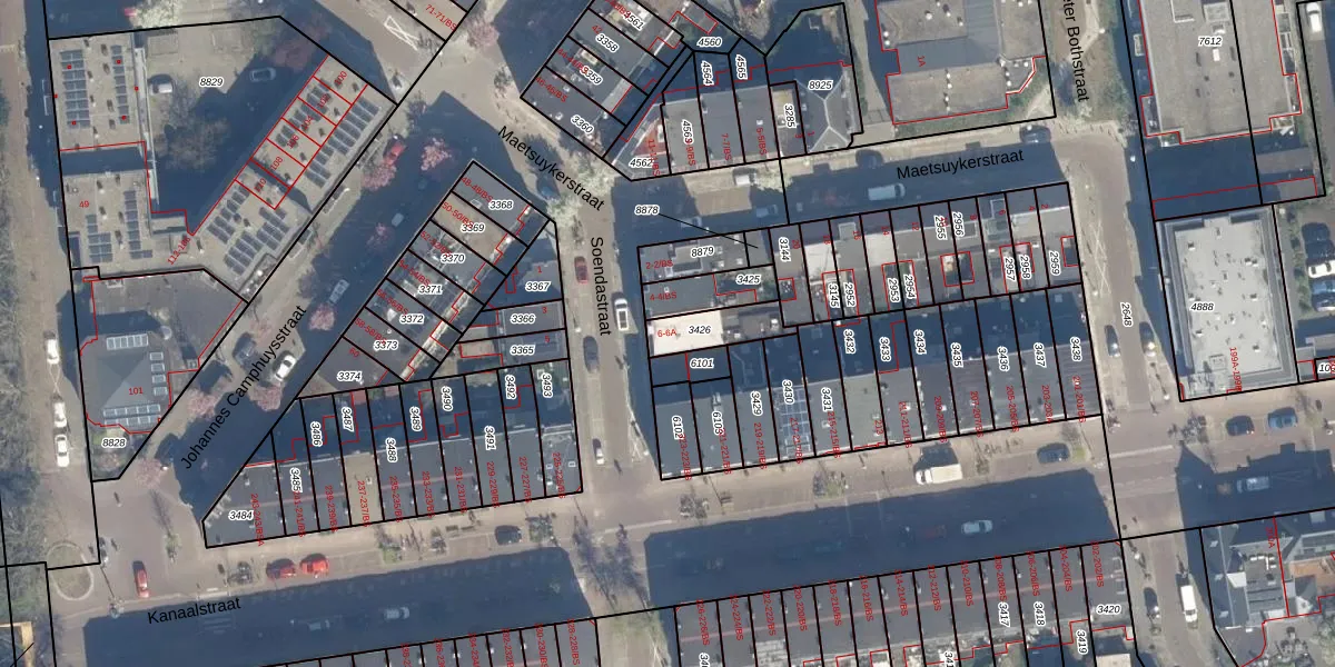 Soendastraat 6-BS is gelegen op kadastraal perceel CTR00C3426. Deze kadastrale aanduiding is uniek en wordt gebruikt door het Kadaster om eigendomsrechten en andere zakelijke rechten vast te leggen. Het perceel maakt onderdeel uit van de kadastrale gemeente Catharijne.