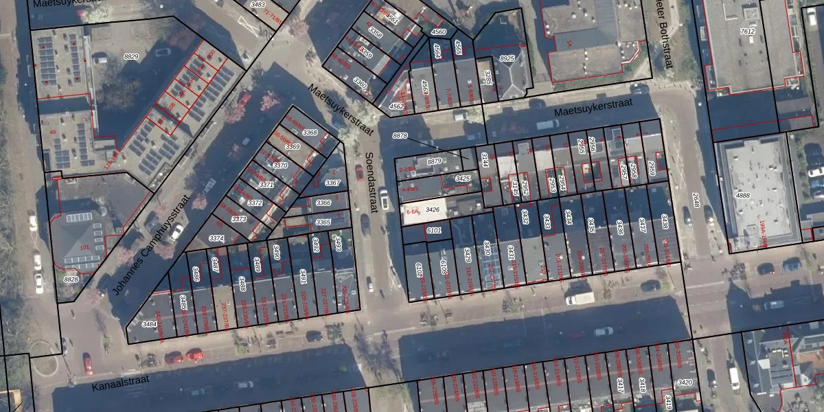 Soendastraat 6-A is gelegen op kadastraal perceel CTR00C3426. Deze kadastrale aanduiding is uniek en wordt gebruikt door het Kadaster om eigendomsrechten en andere zakelijke rechten vast te leggen. Het perceel maakt onderdeel uit van de kadastrale gemeente Catharijne.