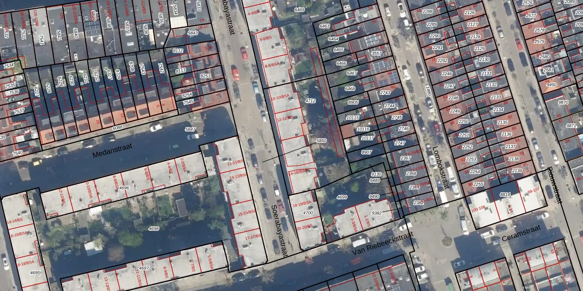 Het perceel waarop Soerabayastraat 14-BS staat heeft een oppervlakte van 850 m². Dit is een groot perceel. De perceeloppervlakte wordt geregistreerd door het Kadaster. Gedetailleerde informatie over de maten van dit perceel kunt u vinden in het rapport Kadastrale kaart met maatvoering van Soerabayastraat 14-BS.
