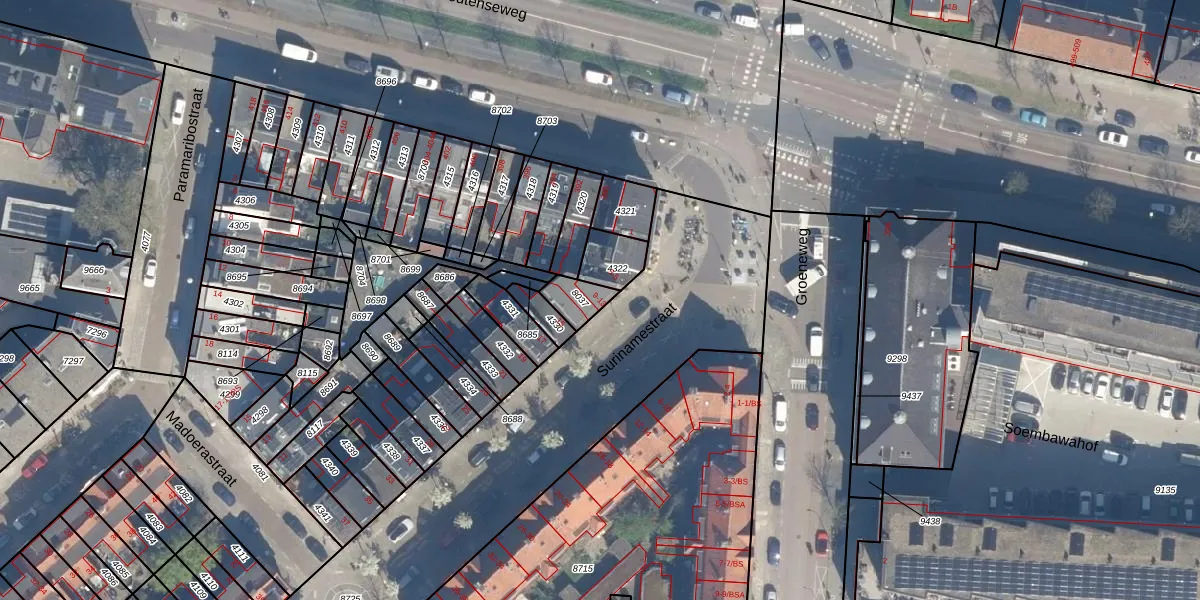 Het perceel waarop Surinamestraat 13 staat heeft een oppervlakte van 63 m². Dit is een klein perceel. De perceeloppervlakte wordt geregistreerd door het Kadaster. Gedetailleerde informatie over de maten van dit perceel kunt u vinden in het rapport Kadastrale kaart met maatvoering van Surinamestraat 13.