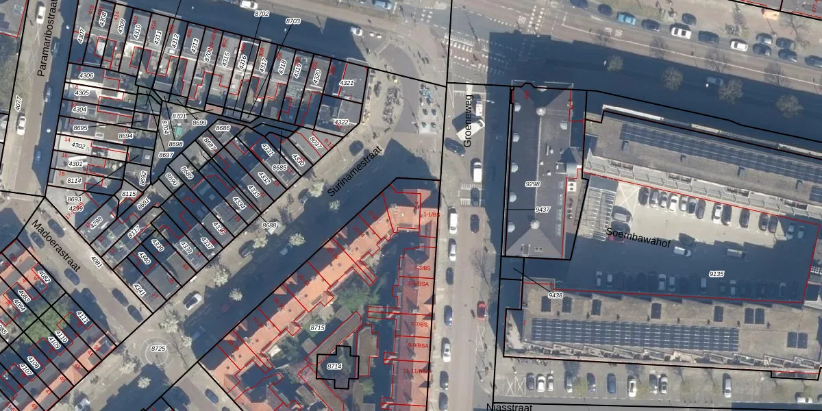 Het perceel waarop Surinamestraat 4 staat heeft een oppervlakte van 2743 m². Dit is een zeer groot perceel. De perceeloppervlakte wordt geregistreerd door het Kadaster. Gedetailleerde informatie over de maten van dit perceel kunt u vinden in het rapport Kadastrale kaart met maatvoering van Surinamestraat 4.