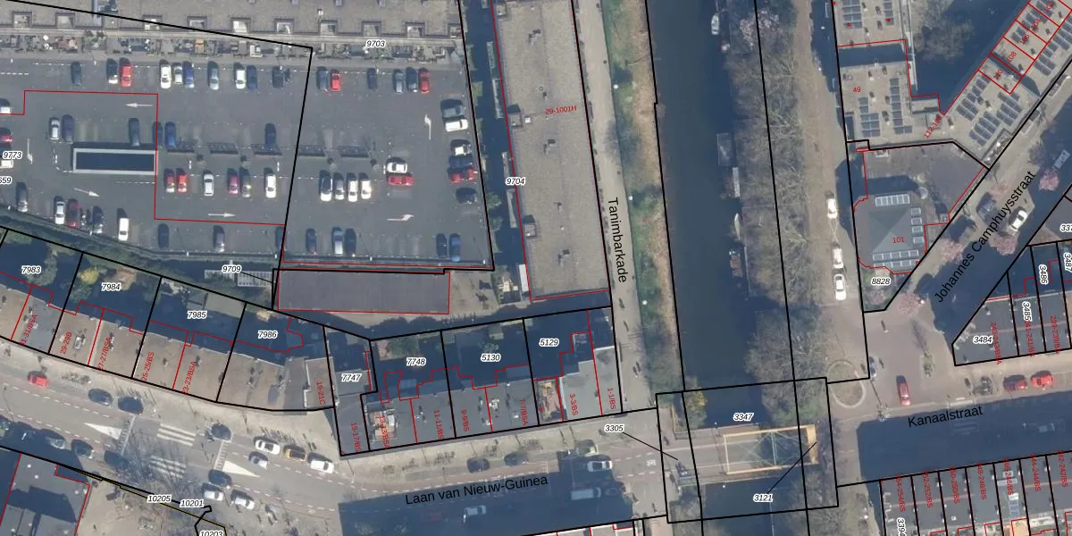 Het perceel waarop Tanimbarkade 55 staat heeft een oppervlakte van 1830 m². Dit is een zeer groot perceel. De perceeloppervlakte wordt geregistreerd door het Kadaster. Gedetailleerde informatie over de maten van dit perceel kunt u vinden in het rapport Kadastrale kaart met maatvoering van Tanimbarkade 55.