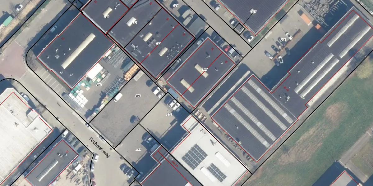 Het perceel waarop Techniekweg 36 staat heeft een oppervlakte van 1037 m². Dit is een zeer groot perceel. De perceeloppervlakte wordt geregistreerd door het Kadaster. Gedetailleerde informatie over de maten van dit perceel kunt u vinden in het rapport Kadastrale kaart met maatvoering van Techniekweg 36.