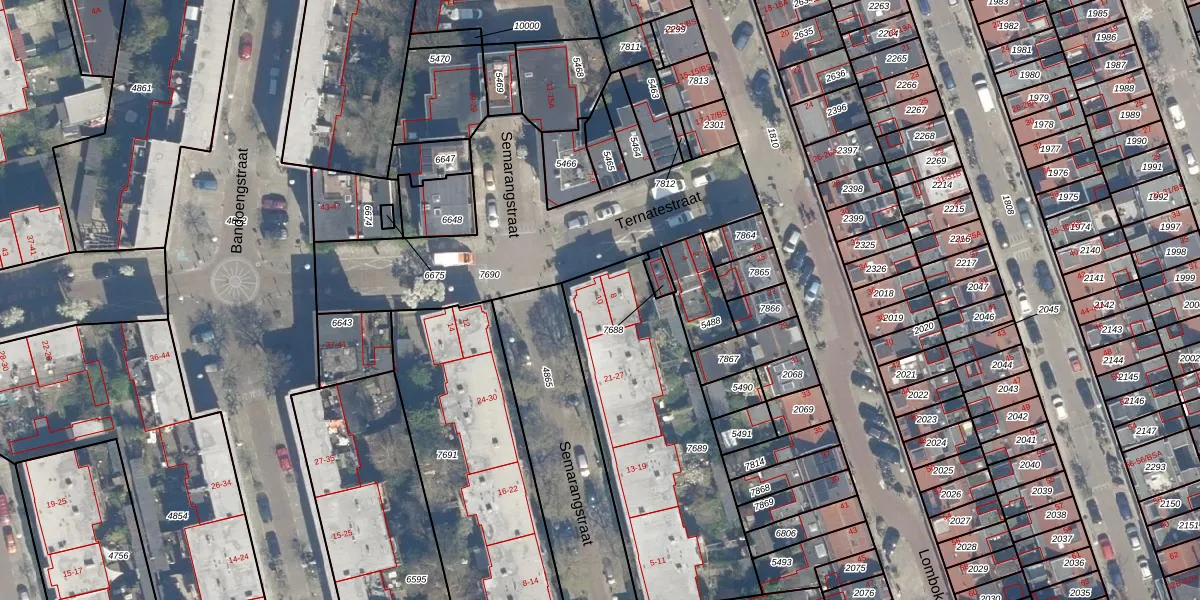 Het perceel waarop Ternatestraat 10 staat heeft een oppervlakte van 1075 m². Dit is een zeer groot perceel. De perceeloppervlakte wordt geregistreerd door het Kadaster. Gedetailleerde informatie over de maten van dit perceel kunt u vinden in het rapport Kadastrale kaart met maatvoering van Ternatestraat 10.