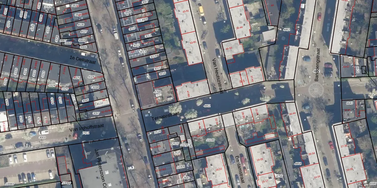 Het perceel waarop Ternatestraat 49 staat heeft een oppervlakte van 2195 m². Dit is een zeer groot perceel. De perceeloppervlakte wordt geregistreerd door het Kadaster. Gedetailleerde informatie over de maten van dit perceel kunt u vinden in het rapport Kadastrale kaart met maatvoering van Ternatestraat 49.