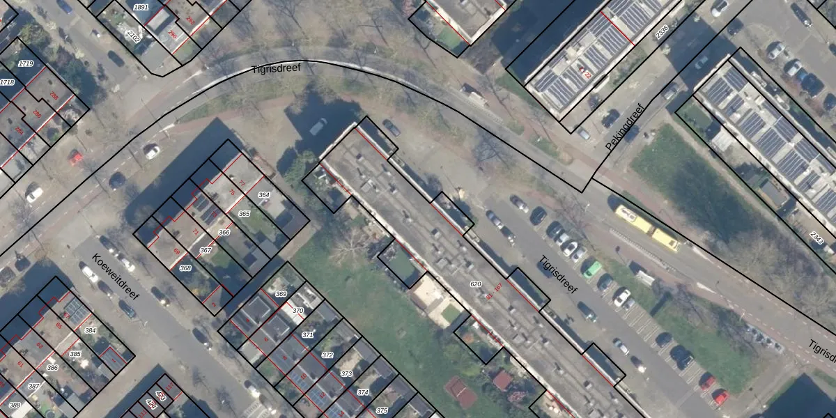 Het perceel waarop Tigrisdreef 101 staat heeft een oppervlakte van 1665 m². Dit is een zeer groot perceel. De perceeloppervlakte wordt geregistreerd door het Kadaster. Gedetailleerde informatie over de maten van dit perceel kunt u vinden in het rapport Kadastrale kaart met maatvoering van Tigrisdreef 101.