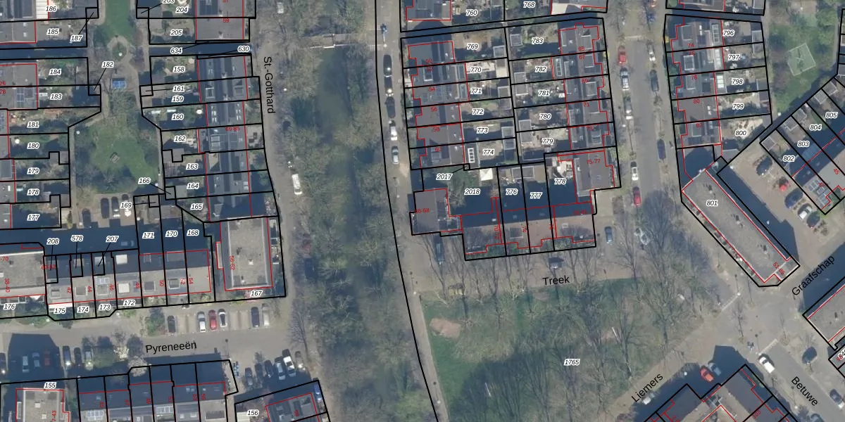 Het perceel waarop Treek 66 staat heeft een oppervlakte van 372 m². Dit is een groot perceel. De perceeloppervlakte wordt geregistreerd door het Kadaster. Gedetailleerde informatie over de maten van dit perceel kunt u vinden in het rapport Kadastrale kaart met maatvoering van Treek 66.