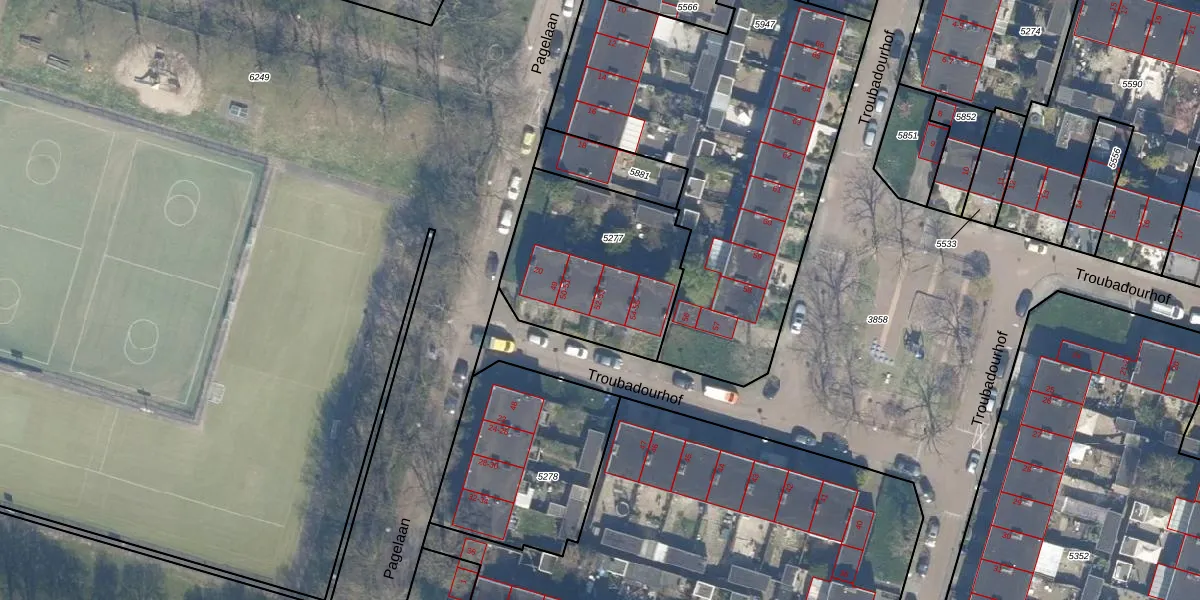 Troubadourhof 52 is gelegen op kadastraal perceel UTT00P5277. Deze kadastrale aanduiding is uniek en wordt gebruikt door het Kadaster om eigendomsrechten en andere zakelijke rechten vast te leggen. Het perceel maakt onderdeel uit van de kadastrale gemeente Utrecht.